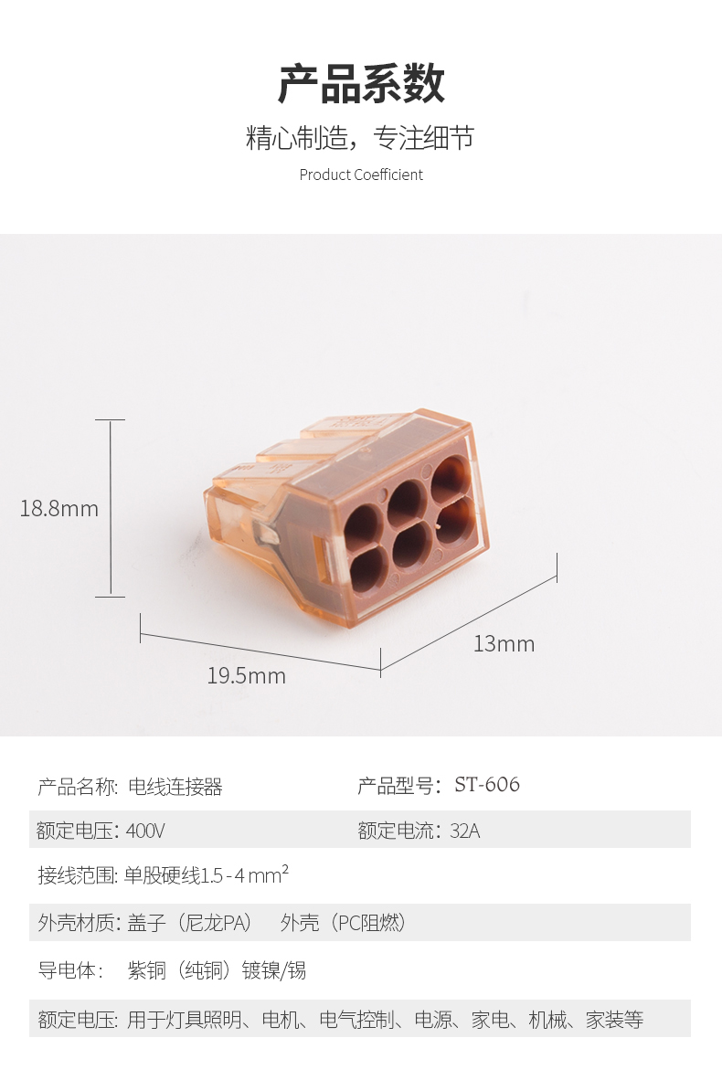 額定電流:400A額定電流:32A導線線徑:1.5-4mm²耐電壓:AC2500V/1Min機械性能環(huán)境溫度:-40°C~+105°C剝線長度:12mm尺寸:19.5*,9.2*,13.1材質(zhì)及電鍍塑件:PC,UL94V-2彈片:不銹鋼觸點材料:電解銅鍍鎳錫