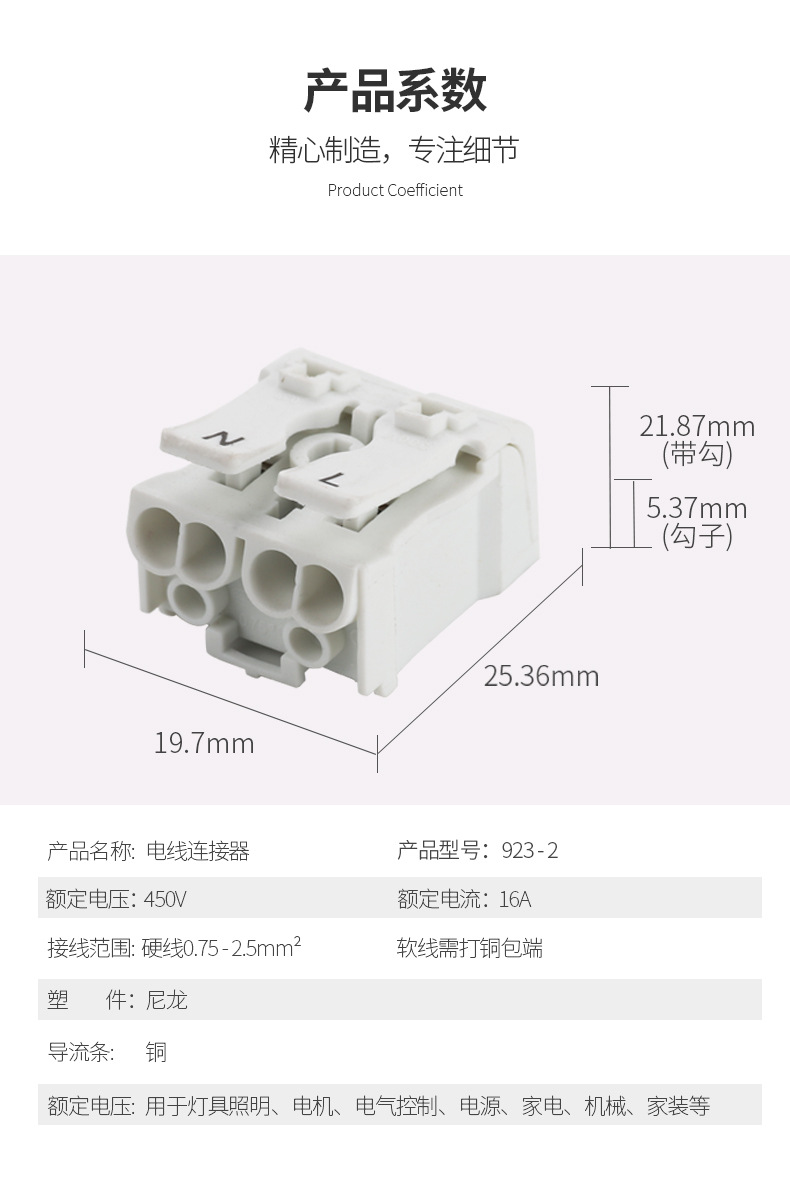 產(chǎn)品名稱(chēng):923接線(xiàn)端子2P產(chǎn)品型號(hào):923-2P適用導(dǎo)線(xiàn):軟硬導(dǎo)線(xiàn) 0.75-2.5mm^2技術(shù)參數(shù):額定電壓 450V 額定電流 24A產(chǎn)品尺寸:20*25*21mm(長(zhǎng)*寬*高)產(chǎn)品材料:外殼 改性尼龍PA66 導(dǎo)流條 電解銅(表面鍍錫) 彈片 301不銹鋼